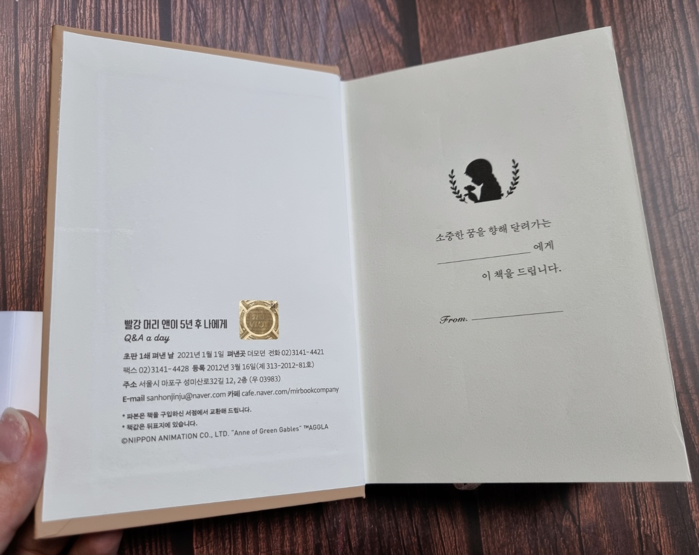 일단 제가 5년 Q&A 다이어리를 구매한 이유를 말씀드릴게요~ 먼저 제 짝꿍이 2017년부터 5년 다이어리를 쓰고 있었어요~ 재밌어 보인것도 있고 뭔가 그래도 보람있어 보였어요. 저는 딱히 글을 잘 못쓸 것 같기도 하고 부지런하지도 않아요. 귀찮아서 분명 몇일 쓰다가 안쓰게 될 것 같아서 차라리 질문에 짤막하게 답변하는게 낫겠다 싶었어요. 게다가 다이어리를 아기자기하고 예쁘게 꾸미는것도 잘 못할것 같아서 이게 딱이다 싶었죠. 제가 구매한 한정판과 기존 책과 다른게 뭔지 서점 직원분께서 여쭤보니 커버만 분위기 있는 베이지색으로 된 것 뿐 안에 내용은 이전버전과 다르지 않다고 했어요. 기존의 앤 다이어리는 진한 고동색같은 버건디 색이었는데 앤의 얼굴이 크게 나와있어서 30대가 쓰기엔 좀 소녀소녀한 커버라서 부담이 갔어요~ 그래서 한정판이어서 라기 보다는 무난해서 베이지 풀커버를 선택했답니다. 사실 곰돌이 푸가 있었으면 상관없이 샀을것 같아요~ 곰돌이푸우 마니아임 ㅋㅋㅋㅋ