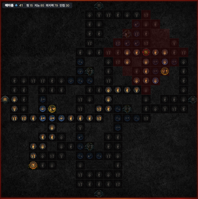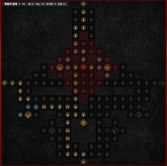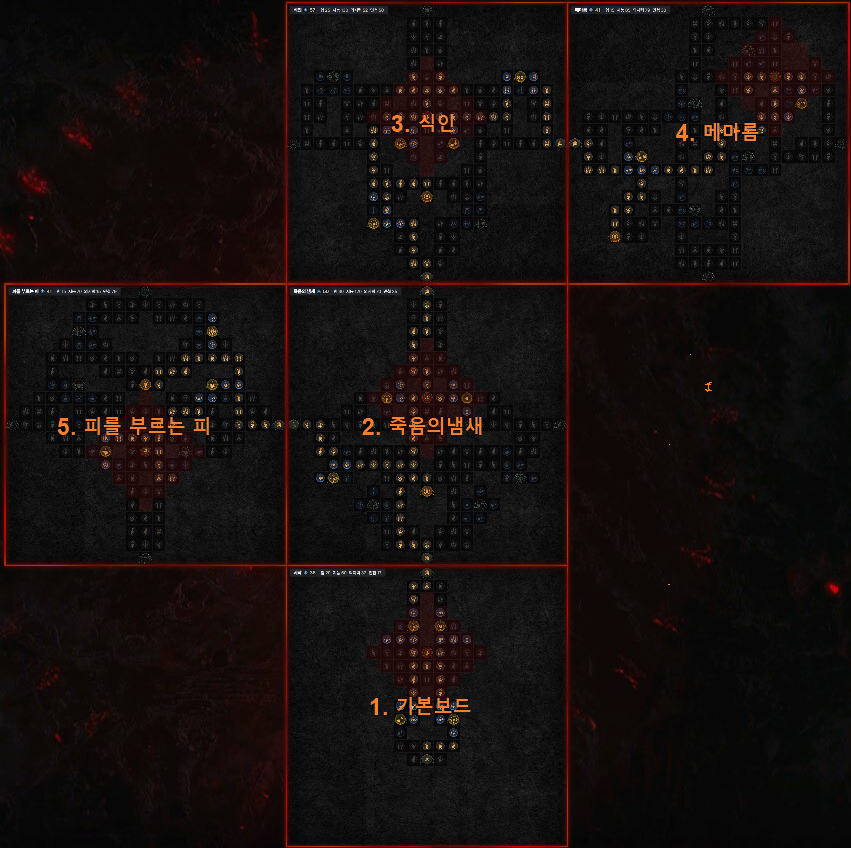 마름병 강령술사(염산네크)에게 가장 중요한 문양, 통제입니다. 여기까지는 최단경로로 와줘야 합니다. 통제에서 지능을 다 챙긴 이후에 4번째 보드로 넘어가서 전설만 찍은 후, 아래 왼쪽 5번째 보드 피를 부르는 피를 완료하고 마지막에 다시 4번째 보드 메마름으로 와서 문양까지 찍으면서 마무리해 줍니다.